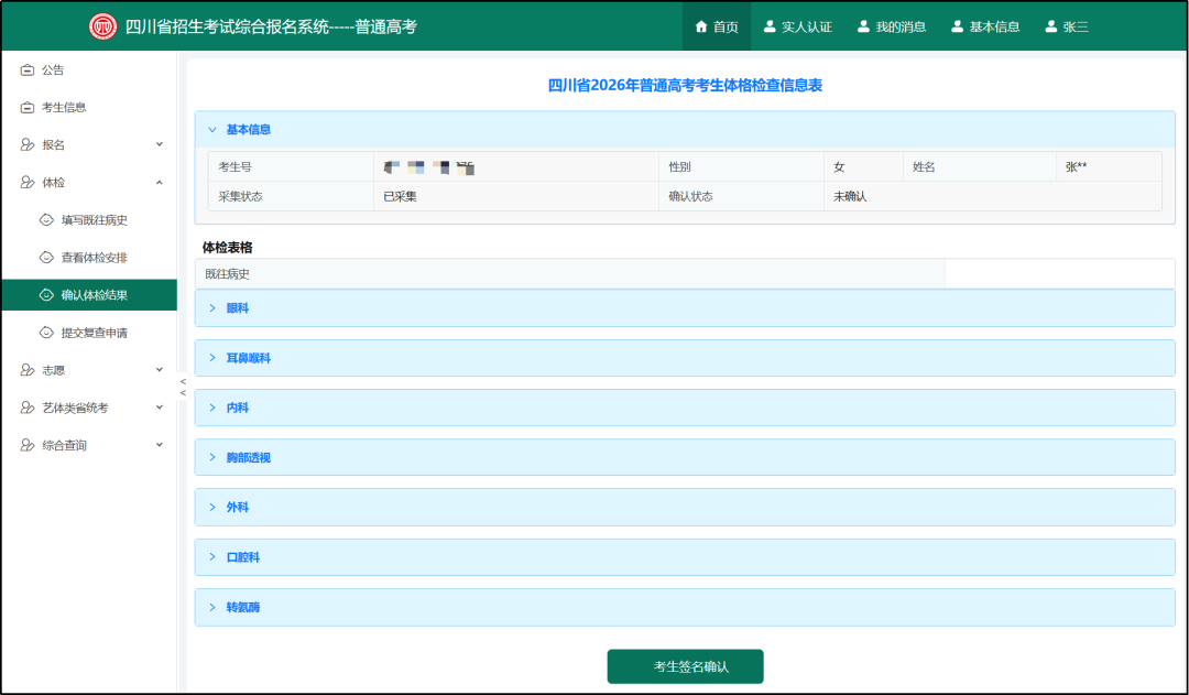 体检完成后,考生可在规定时间内查看体检结果,点击“确认体检结果”菜单并在末尾进行签字确认。参加体检的所有考生都须签字确认。
